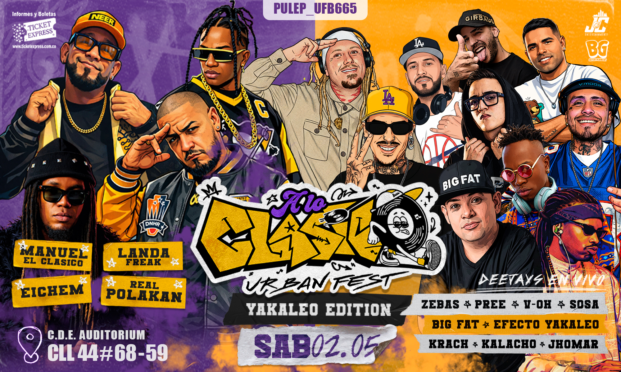 A LO CLÁSICO URBAN FEST es más que un festival; es una máquina del tiempo directa a la “época dorada” del movimiento urbano. Revivimos la esencia del año 2000, donde el Reggaetón, Dancehall, Hip Hop y R&B dominaban las calles. En nuestra primera edición YAKALEO EDITION, tenemos como invitados internacional a dos grandes y pioneros del Reggaeton MANUEL del dúo Maicol & Manuel y POLACO del duo Lito & Polaco, quienes estarán a cargo de cantar en vivos grandes éxitos del Reggaeton Old School, en la cuota de artistas nacionales contaremos con la participación de unos de los artistas más versátiles del Genero Urbano Colombiano LANDA FREAK, [actualmente hace parte del elenco de artistas y musicalización en le seria de Netflix Y Caracol Tv LA REINA DEL FLOW 3], desde cali Colombia EICHEM, unos de los artistas representativos del valle, con su sonido inspirados en el Dancehall de la vieja escuela. La curaduría y selecta musical estará a cargo de un cartel de DJ´s con experiencia desde la época de los 2mil, Dj BIG FAT (Vinyl SET) , Dj Pree (Vinyl SET), Dj Voh, Efecto Yakaleo, Dj Kalacho, Dj Zebas, Dj Jhomar, Dj Krash, Dj Sosa.